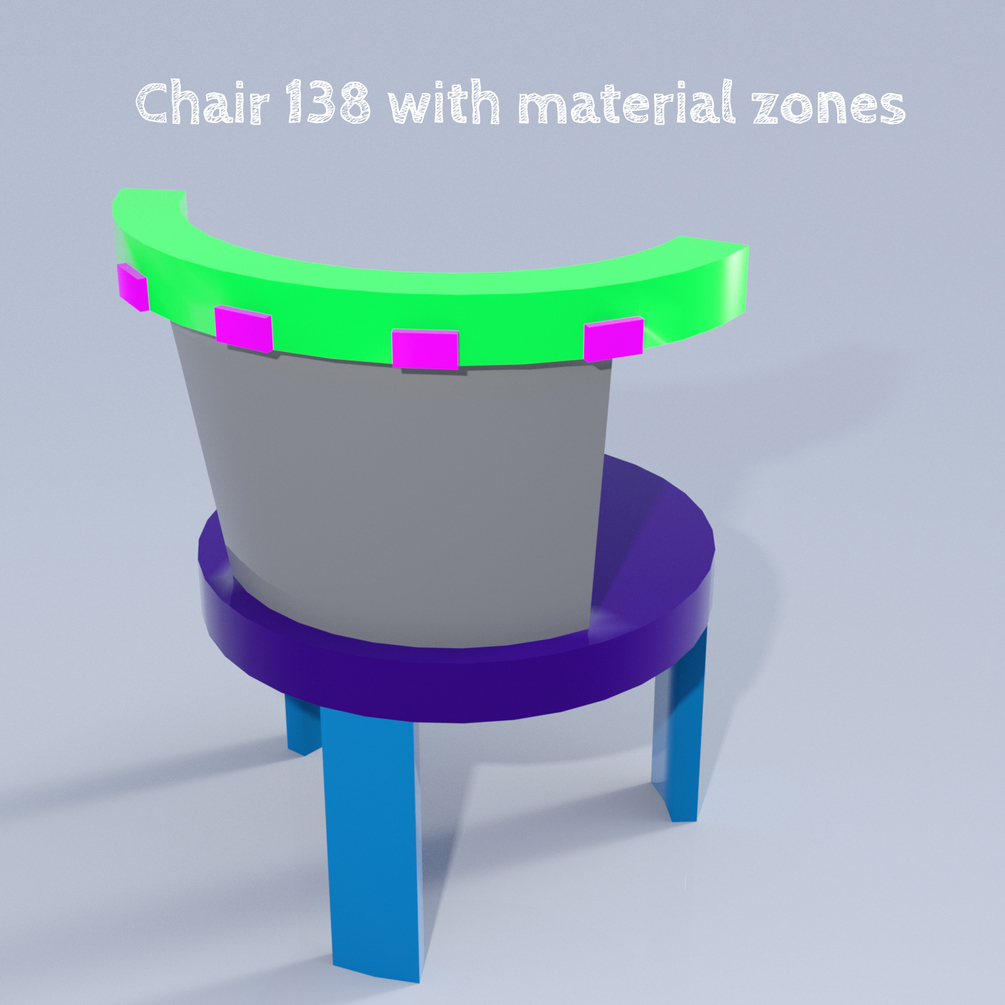 Chair 138 is a replica of a real chair, the prop for DAZ Studio comes with several material zones for the arms, arm details, back, seat and legs so you can mix and match colors / textures.